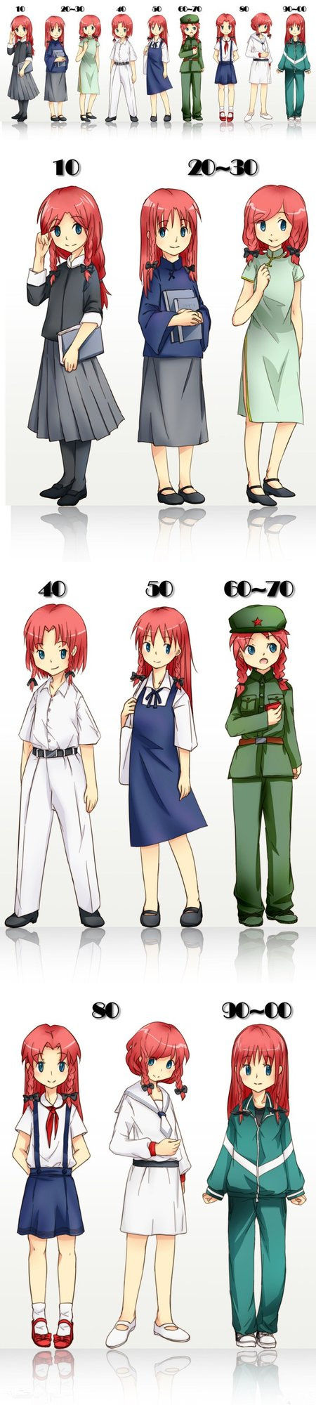 由于上個(gè)十年的審美口味余溫未消,所以在校服在設(shè)計(jì)上參考了很多“軍事元素”。黃軍裝太土、迷彩服太雜、一身白的空軍裝扮不耐臟,于是白襯衫和天藍(lán)色褲子和背帶裙的模仿海軍軍裝的校服應(yīng)運(yùn)而生。不過,這個(gè)時(shí)候的校服也還是雜亂無章的,沒有統(tǒng)一的標(biāo)準(zhǔn)、沒有規(guī)范的樣式,每個(gè)學(xué)校都有自己的“審美”。