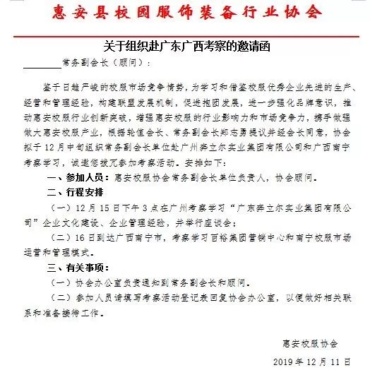 為學習和借鑒校服優(yōu)秀企業(yè)先進的生產(chǎn)、經(jīng)營和管理經(jīng)驗,構建聯(lián)盟發(fā)展機制,促進企業(yè)抱團發(fā)展,進一步強化品牌意識,推動惠安校服行業(yè)創(chuàng)新突破,增強惠安校服的行業(yè)影響力和市場競爭力,攜手做強做大惠安校服產(chǎn)業(yè),12月15~17日,惠安縣校園服飾裝備行業(yè)協(xié)會會員單位赴廣東、廣西進行考察交流活動。活動期間先后考察廣東奔立爾集團、廣東雅藝服飾、百裕集團