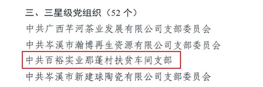 近日,中共梧州市委員會(huì)組織部印發(fā)《關(guān)于公布2020年度梧州市兩新組織星級(jí)黨組織名單的通知》,對(duì)全市109家兩新組織星級(jí)黨組織名單進(jìn)行公布,其中,百裕實(shí)業(yè)黨支部獲評(píng)“五星級(jí)黨組織”稱(chēng)號(hào),育龍黨支部獲評(píng)“四星級(jí)黨組織”稱(chēng)號(hào),百裕那蓬扶貧車(chē)間獲評(píng)“三星級(jí)黨組織”稱(chēng)號(hào)。