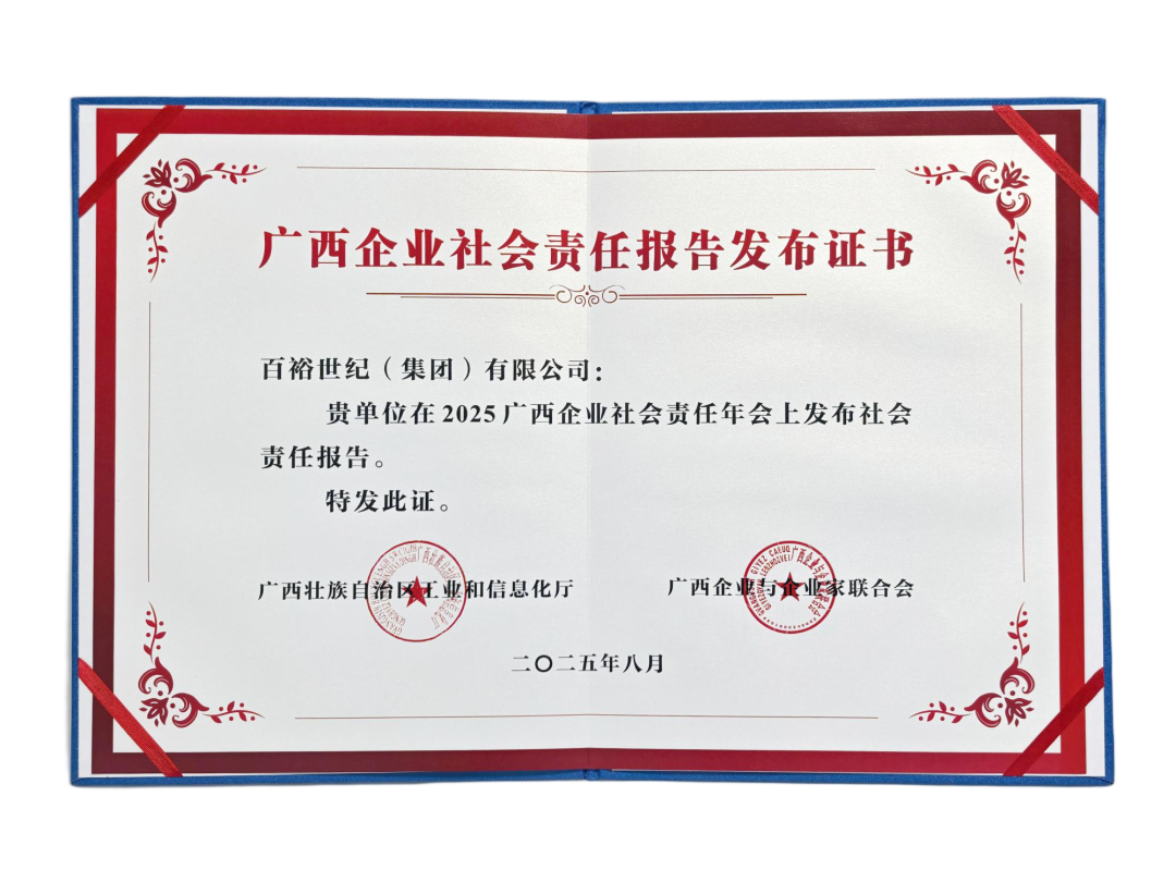 8月27日,由自治區(qū)工業(yè)和信息化廳、廣西企業(yè)與企業(yè)家聯(lián)合會共同主辦的2025廣西企業(yè)社會責任年會在南寧隆重舉行。會上發(fā)布了百裕集團2024年度社會責任報告。