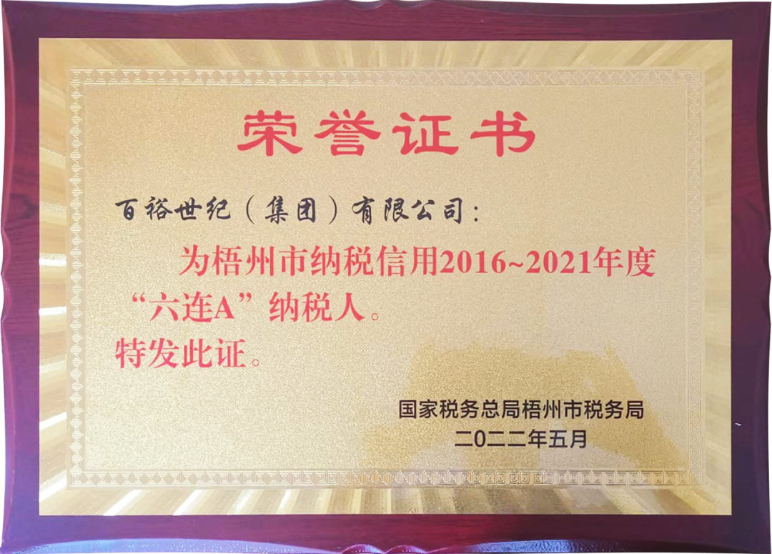 近日,經(jīng)國(guó)家稅務(wù)總局梧州市稅務(wù)局評(píng)審,百裕世紀(jì)(集團(tuán))有限公司被評(píng)為2016~2021年度“六連A”納稅人,這是我們堅(jiān)持依法、誠(chéng)信經(jīng)營(yíng)的實(shí)質(zhì)成果。