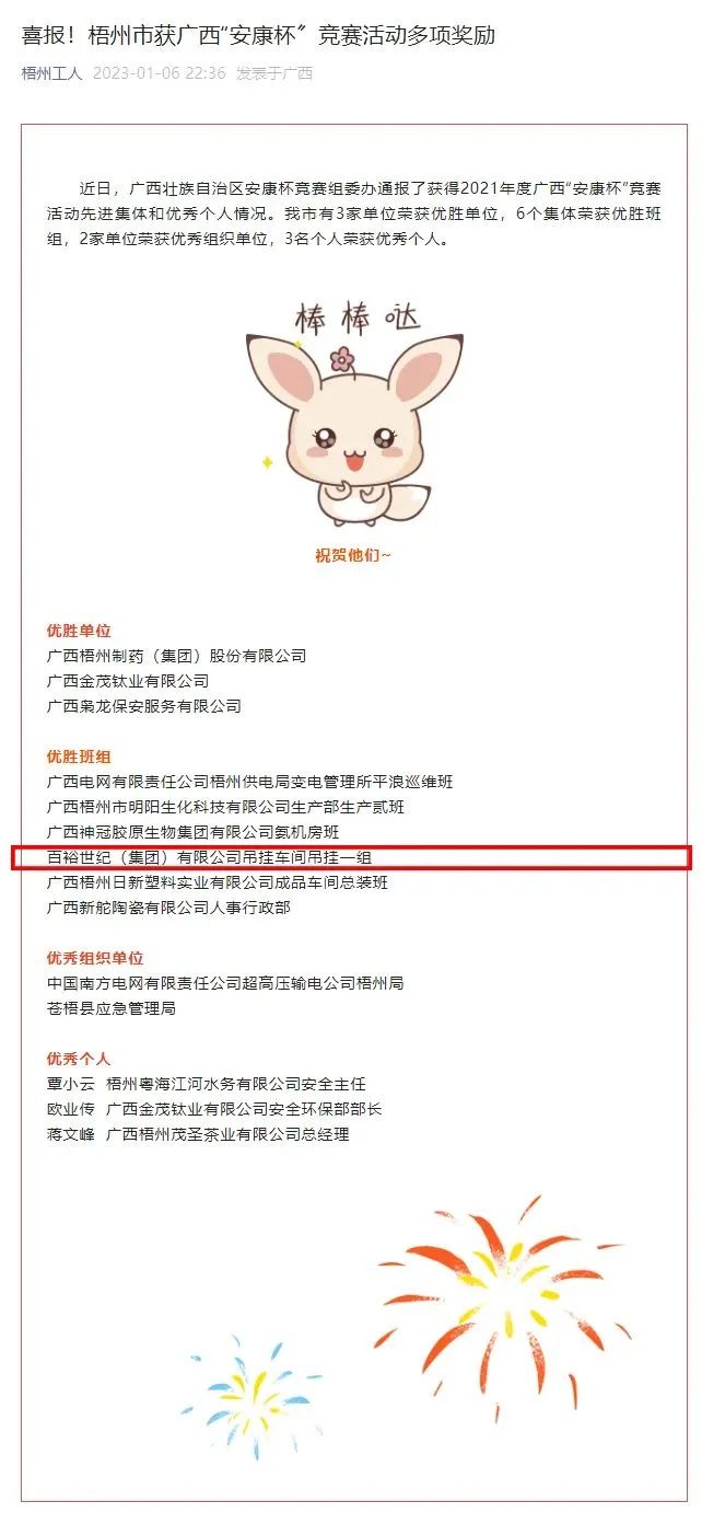 1月06日,廣西壯族自治區(qū)安康杯競賽組委辦通報(bào)了獲得2021年度廣西“安康杯”競賽活動(dòng)先進(jìn)集體和優(yōu)秀個(gè)人情況。百裕世紀(jì)(集團(tuán))有限公司吊掛車間吊掛一組榮獲“優(yōu)勝班組”稱號。