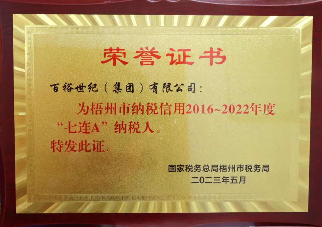 近日,經(jīng)國家稅務(wù)總局梧州市稅務(wù)局評(píng)審,百裕世紀(jì)(集團(tuán))有限公司被評(píng)為2016~2022年度“七連A”納稅人,這是我們堅(jiān)持依法、誠信經(jīng)營的實(shí)質(zhì)成果。