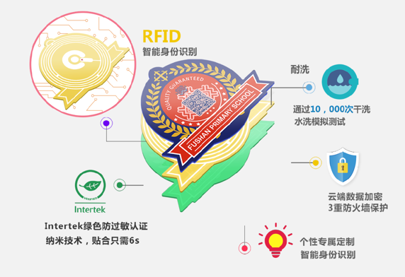 這兩塊標(biāo)識(shí)分別是RFID智能傳感芯片和智能二維碼?;?它們有效提升了校服的科技感。
