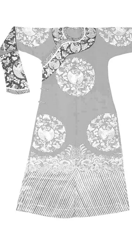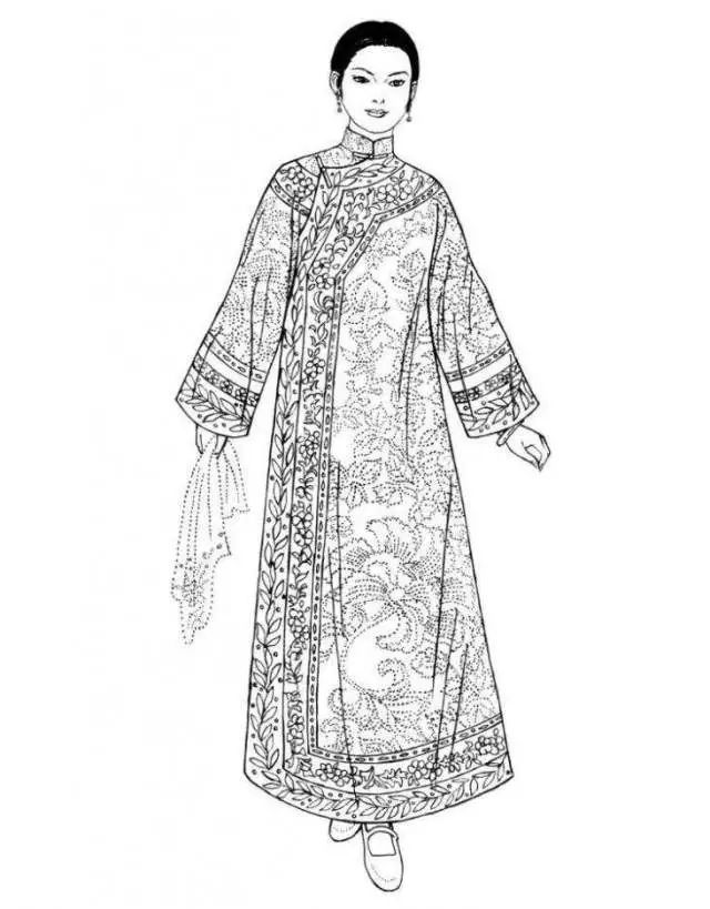 清朝后期,旗女(滿洲女子)所穿的長袍,衣身較為寬博,造型線條平直硬朗,衣長至腳踝。“元寶領(lǐng)”用得十分普遍,領(lǐng)高蓋住腮碰到耳,袍身上多繡以各色花紋,領(lǐng)、袖、襟、裾都有多重寬闊的滾邊。同治年間,鑲、滾技藝達(dá)到高峰時期,有的甚至整件袍服全用刺繡、花邊鑲滾,幾乎難以辨認(rèn)原本的衣料。旗女袍服的裝飾繁瑣至登峰造極的程度,從另一個方面也凸顯了強權(quán)霸主的欲望。