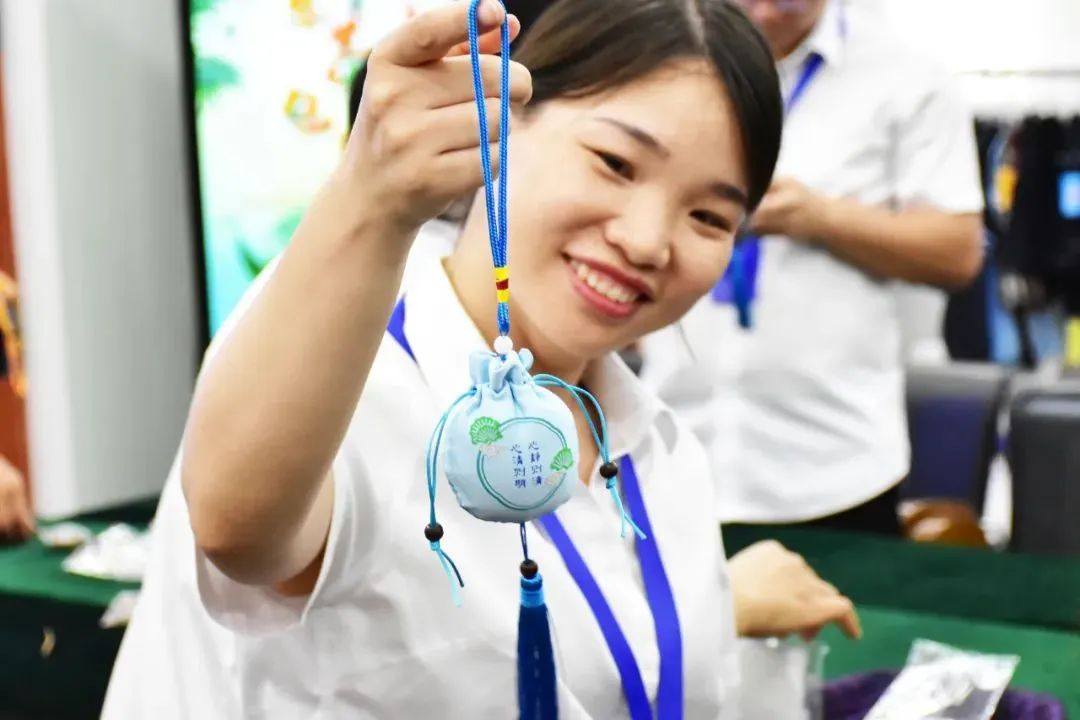 整個活動現(xiàn)場祥和喜樂,大家熱情高漲。伴隨著歡聲笑語,活動步入了尾聲,一個個精致的荷包出現(xiàn)在大家的手中,大家競相展示成果,分享喜悅,佩戴香囊合影留念。